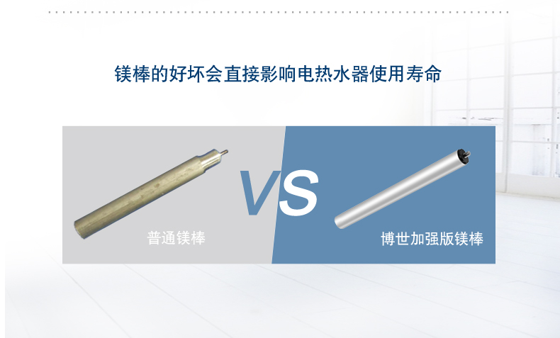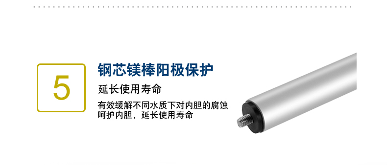 鋼芯強(qiáng)力陽極棒,有效緩解不同水質(zhì)下對內(nèi)膽的腐蝕,大大延長熱水器的使用壽命。